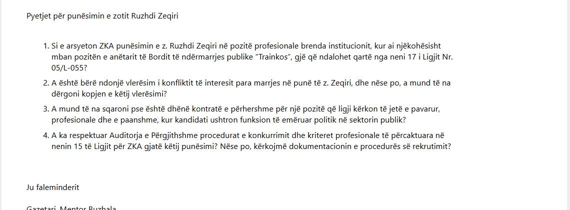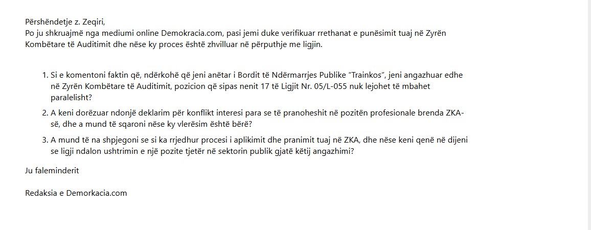 Demokracia.com ka kërkuar sqarime nga Agjencia Kundër Korrupsionit (AKK) nëse një anëtar i bordit të një ndërmarrjeje publike mund të ushtrojë njëkohësisht edhe pozitë profesionale në një institucion tjetër publik, siç është ZKA, e cila auditojnë ndërmarrjet publike, përfshirë edhe Trainkos-in.