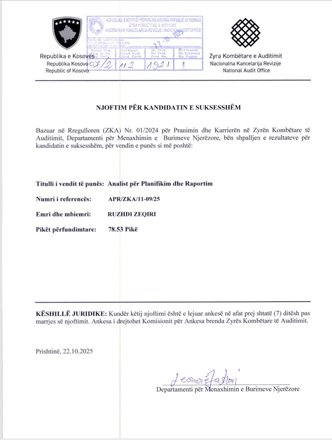 ZKA kishte hapur konkurs për Analist për Planifikim dhe Raportim në shtator 2025. Më 26 shtator ishte publikuar lista e ngushtë, dhe më 22 tetor fitues me 78.58 pikë kishte dalë Ruzhdi Zeqiri.