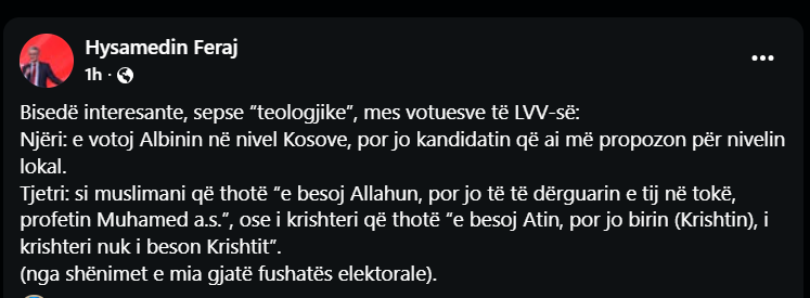 Në një status në Facebook, Hysamedin Feraj i Vetëvendosjes, duke pretenduar se po i referohet një bisedë mes dy votuesve të partisë, artikuloi një analogji teologjike skajshmërisht groteske, teksa përpiqet të delegjitimojë votuesit që mbështesin Albin Kurtin në nivel qendror, por refuzojnë kandidatët lokalë të sponsorizuar prej tij, duke i reduktuar në “mëkatarë” politikë.