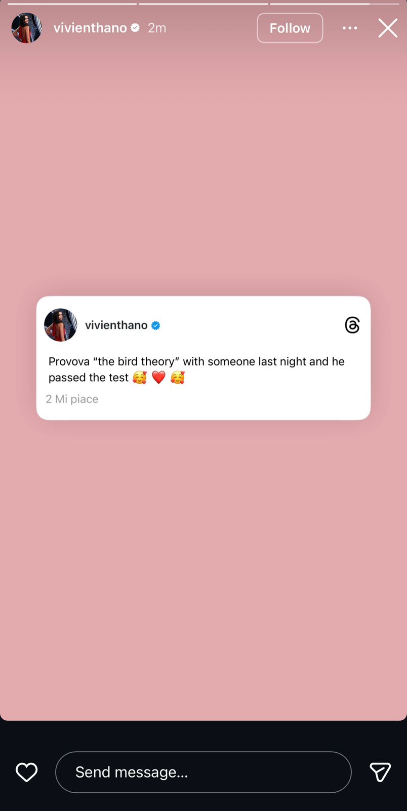 Ajo shkruan: “Provova ‘teorinë e zogut’ me dikë mbrëmë dhe ai e kaloi testin 🥰❤🥰.”