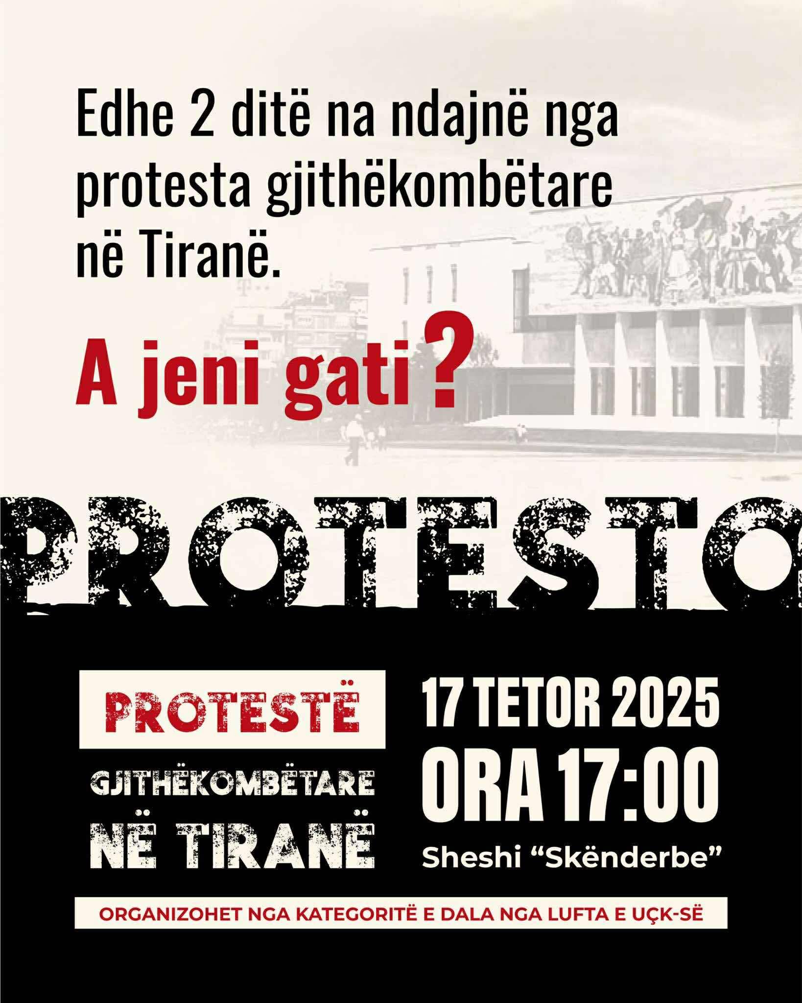Kryeministri i Shqipërisë, Edi Rama, do të marrë pjesë në protestën që do të zhvillohet më 17 tetor në orën 17:00 në sheshin Skënderbej në Tiranë, në mbështetje të ish-krerëve të Ushtrisë Çlirimtare të Kosovës (UÇK). Lajmi është bërë i ditur nga Organizata e Veteranëve të Luftës së UÇK-së, e cila thekson se kjo protestë do të jetë një akt solidariteti për ata që luftuan për çlirimin dhe pavarësinë e Kosovës.
