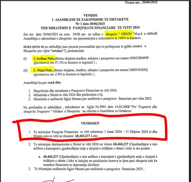 VoxNews shfletoi dokumente nga Qendra Kombëtare e Biznesit ku rezulton se kompania “Orion” ka si pronar Ardian Nelon me 97.20% dhe Niazi Nelon me 2.80 %. Në vitin 2025 kjo kompani ka publikuar bilancet e fitimit të një viti më parë, ku rezulton se fitimi neto në atë vit ka qenë 68,460,237 lekë.