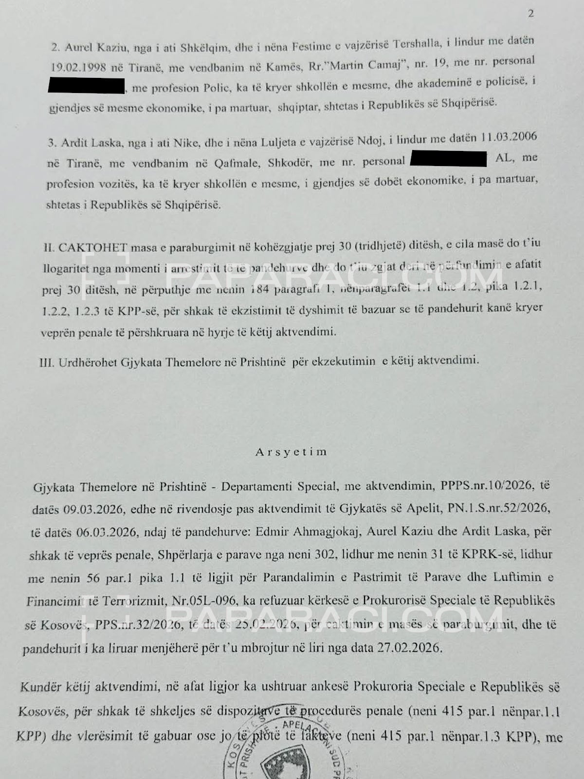 Aktvendimi për caktimin e masës së sigurisë ndaj tre të dyshuarve ka marrë formë të prerë të mërkurën, raporton Paparaci.