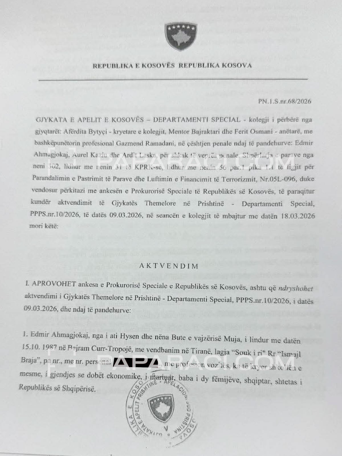 Gjykata e Apelit ka nxjerrë sot vendim përmes të cilit e ka ndryshuar aktvendimin e Gjykatës Themelore në Prishtinë, i cili i la të lirë tre të dyshuarit Aurel Kaziu, pjesëtar i Policisë së Shqipërisë, dhe Ardit Laska dhe Edmir Ahmagjokaj. Tre të dyshuarit janë shtetas të Shqipërisë.