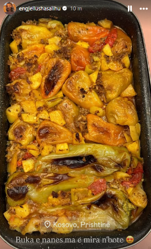 Engjëllusha në një tavë me speca të mbushur shkruan “Buka e nanës ma e mira në botë”.