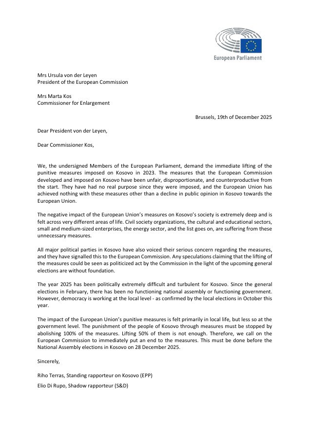 Një grup eurodeputetësh i ka dërguar letër presidentit të Këshillit Evropian, ku kanë kërkuar nga Von der Leyen dhe Komisionerja Marta Kos që të gjitha masat ndaj Kosovës të hiqen menjëherë.