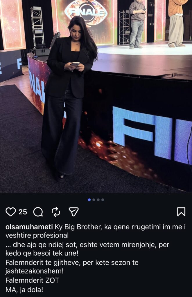 “Ky Big Brother ka qenë rrugëtimi im më i vështirë profesional… dhe ajo që ndiej sot është vetëm mirënjohje për këdo që besoi tek unë. Falemnderit të gjithëve për këtë sezon të jashtëzakonshëm! Falemnderit ZOT. Ma, ja dola!”, ka shkruar Muhameti.