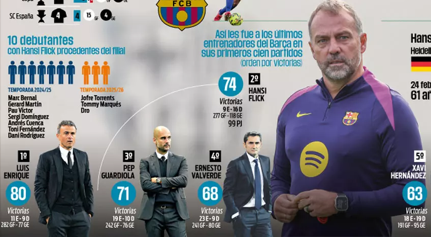 Statistikat e Flick tregojnë qartë filozofinë e tij: futboll si spektakël, mbrojtje e avancuar dhe shfrytëzim maksimal i lojtarëve të rinj. 37 futbollistë janë aktivizuar nën drejtimin e tij, me Jules Koundé (91 ndeshje) dhe Cubarsí (89) në krye, ndërsa Lamine Yamal vazhdon të përfitojë nga trajtimi i gjermanit.