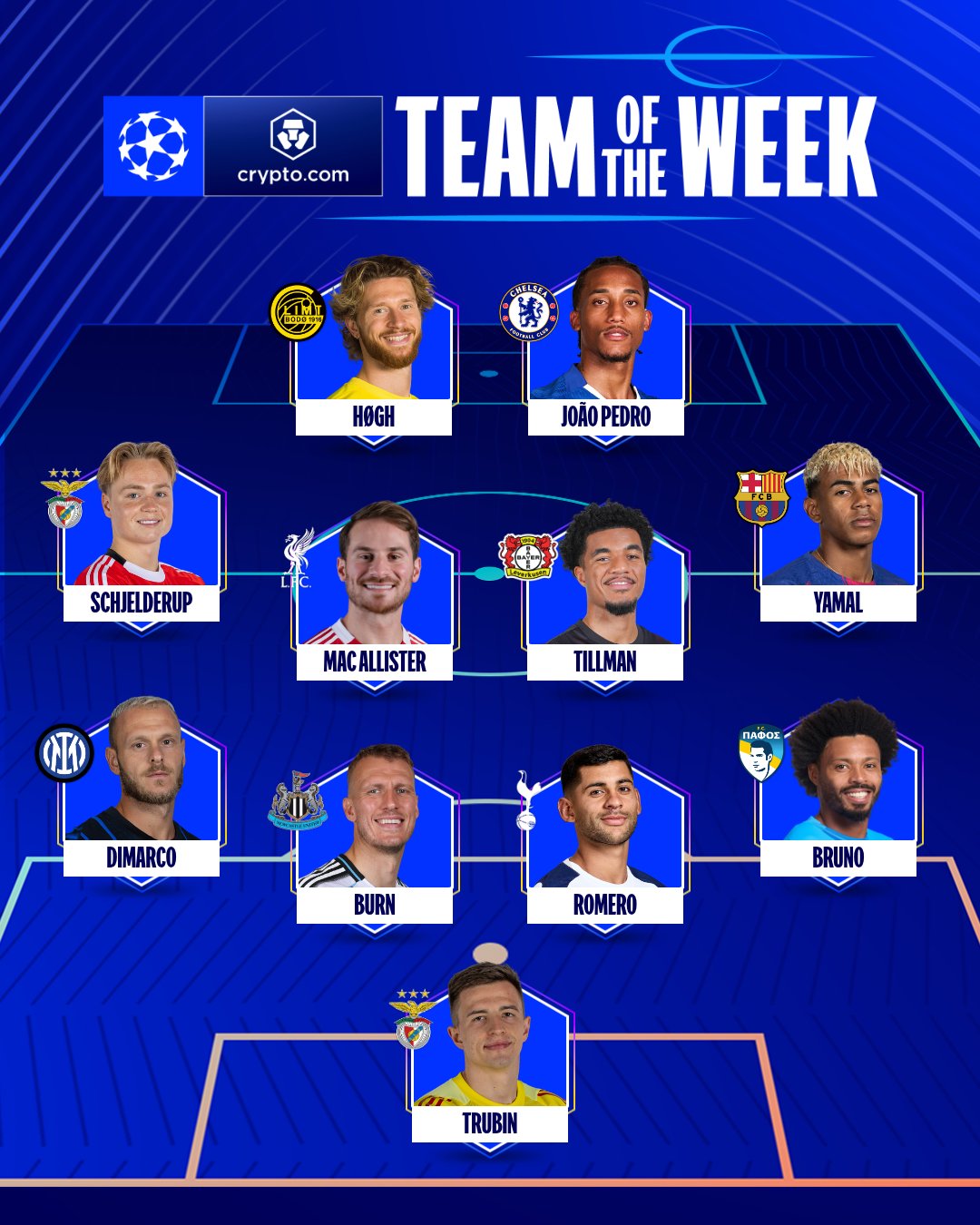 Qendra e mbrojtjes është Cristian Romero i Tottenham dhe Dan Burn i Newcastle, në krah janë zgjedhue Federico Dimarco i Interit dhe Bruno i Pafos. Në mesfushë, Schjeldrup i Benfica, i cili luajti një ndeshje të madhe mbrëmë. Alexis Mac Allister dhe Malik Tillman në qendër të mesfushës. Po ashtu ka vend edhe për Lamine Yamal në krah, i cili shkëlëqeu në përmbysjen e Barcelonës ndaj Copenhagen.