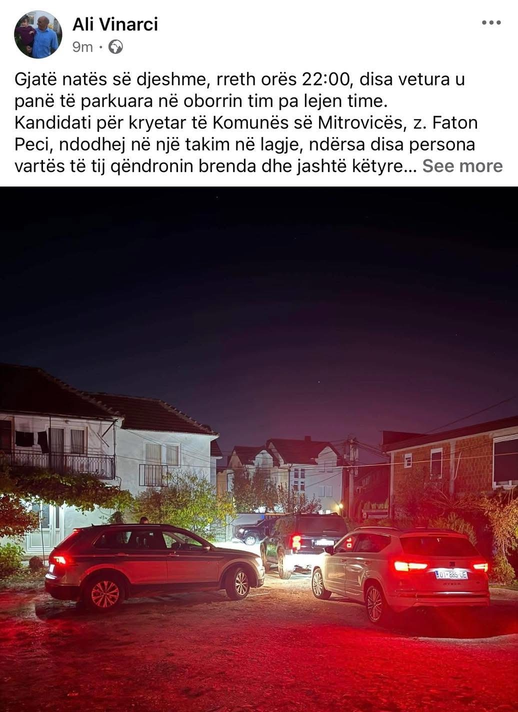 “Gjatë natës së djeshme, rreth orës 22:00, disa vetura u panë të parkuara në oborrin tim pa lejen time. Kandidati për kryetar të Komunës së Mitrovicës, z. Faton Peci, ndodhej në një takim në lagje, ndërsa disa persona vartës të tij qëndronin brenda dhe jashtë këtyre veturave, duke shkaktuar shqetësim në orët e vona të mbrëmjes. Pas rreth një ore, dolëm dhe, me mirësjellje, kërkuam që ata të largoheshin nga prona jonë private”./Demokracia.com/.