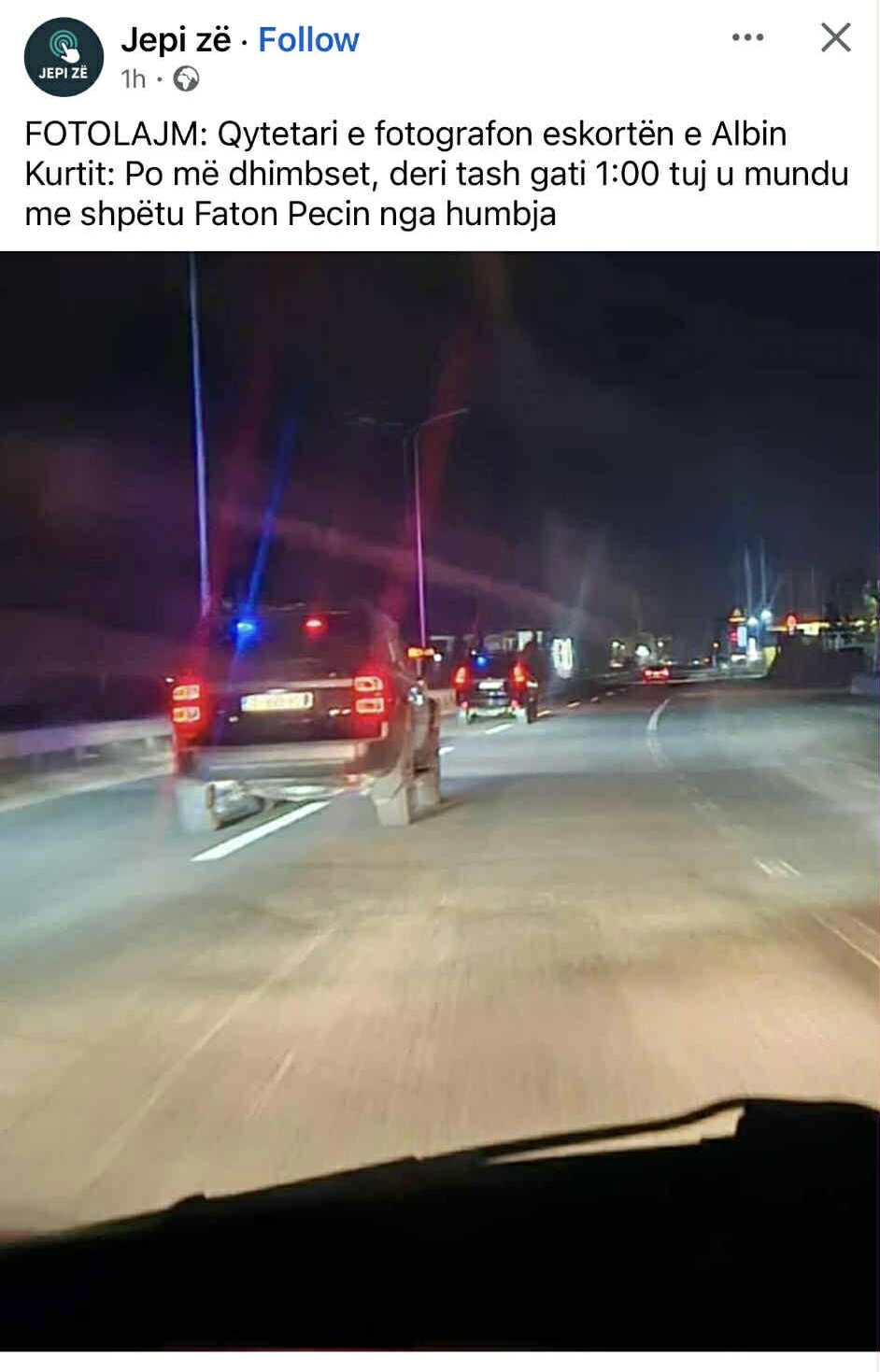 Një qytetar ka shpërndarë fotografi të eskortës zyrtare të Kurtit, duke shkruar: “Po më dhimbset, deri tash gati ora 1:00, tuj u mundu me shpëtu Faton Pecin nga humbja”, shkruan Demokracia.com.