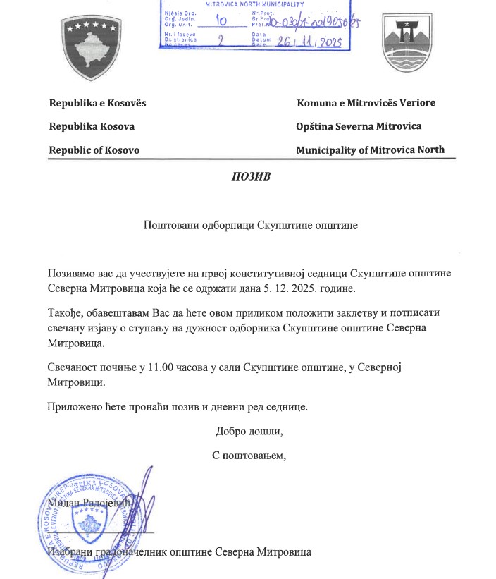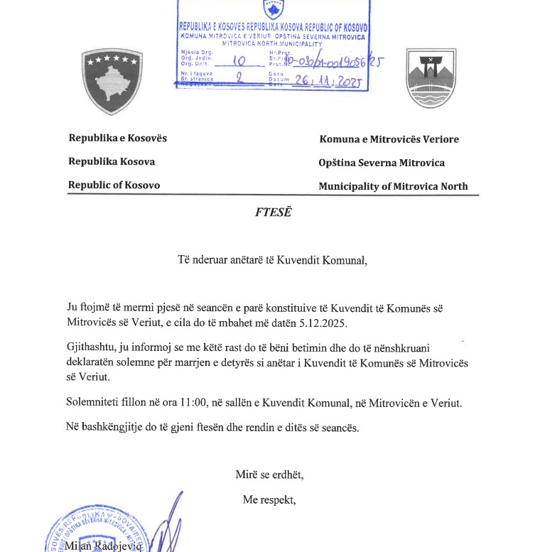 Lista Serbe është tërhequr pas ftesës për seancën konstituive të Mitrovicës së Veriut, pasi dokumenti fillestar nuk përmbante shënimin zyrtar “Republika e Kosovës”.