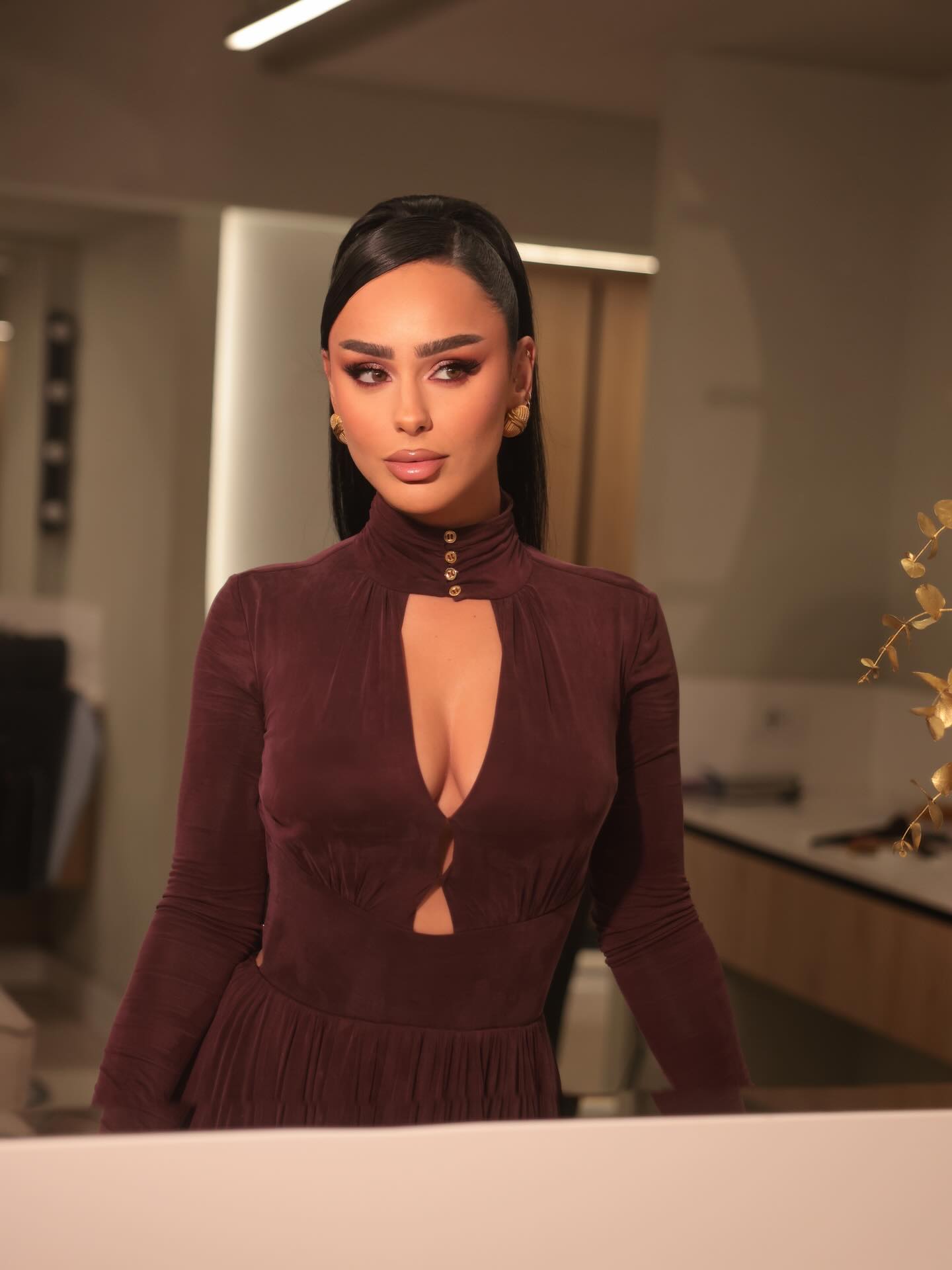 Prerja e veçantë e fustanit thekson linjat trupore, ndërsa grimi profesional dhe flokët e stiluar thjeshtë i japin pamjes një elegancë të rafinuar.