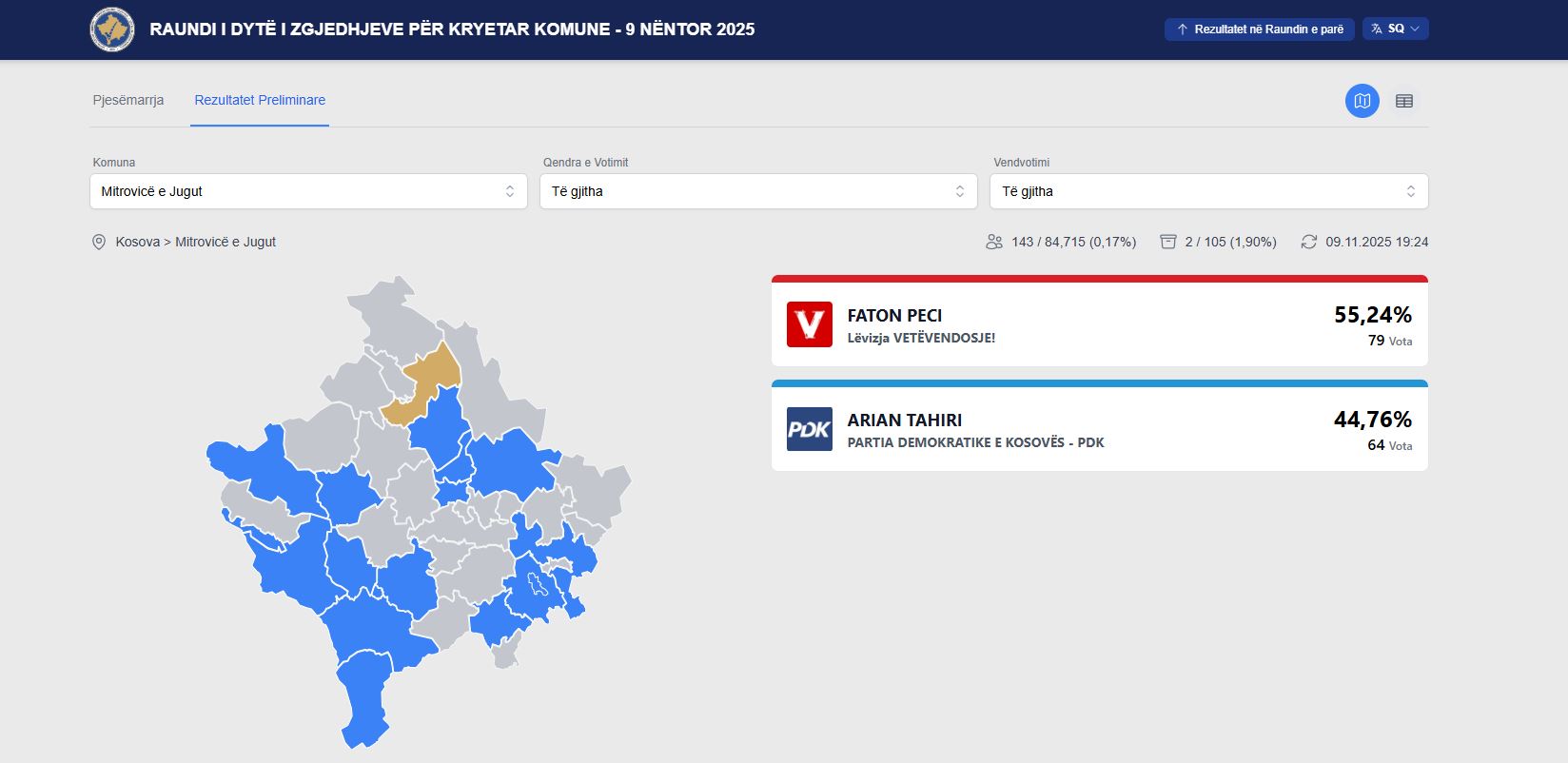 Deri tani atje janë numëruar vetëm 2 vendvotime, apo 143 vota nga 84 mijë e 715 vota. /Klankosova.tv