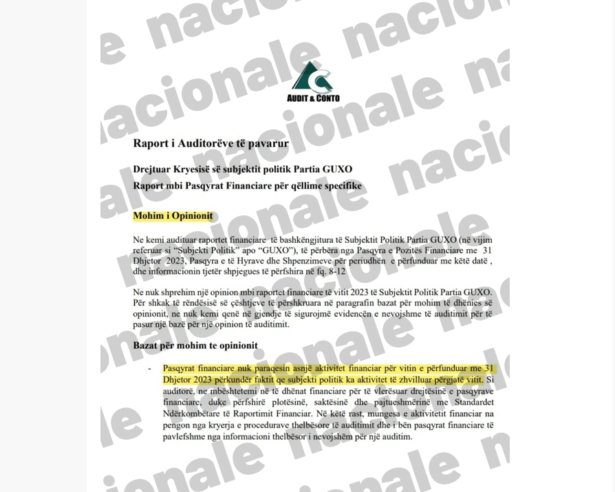 Nacionale kishte raportuar se gjatë auditimit të raporteve financiare të vitit 2023, auditorët kanë gjetur se partia politike Guxo nuk ka deklaruar asnjë aktivitet financiar.