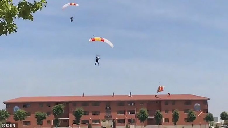 Ky është momenti rrëqethës kur një parashutist përplaset në kulmin e një ndërtese gjatë ushtrimeve ushtarake. E sikur kjo të mos mjaftonte, ai më pas rrëzohet nga kulmi i ndërtesës në tokë, duke i shokuar të pranishmit e shumtë që ishin mbledhur për të parë nga afër ushtrimet.