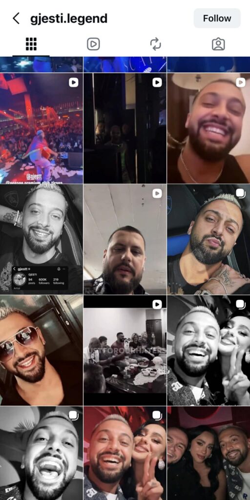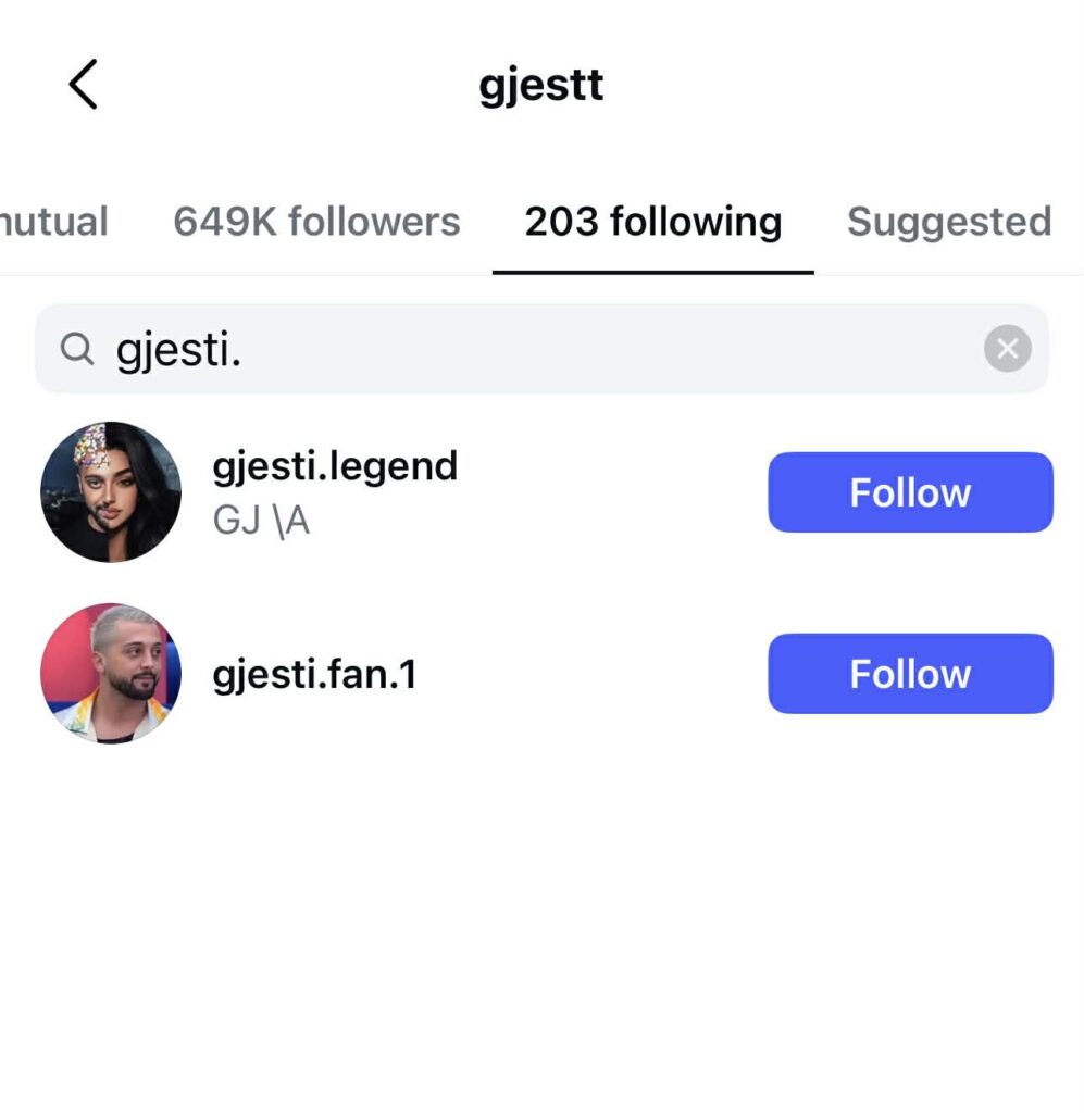 Mes pak emrave që Gjesti ndjek në Instagram, është edhe faqja “gjesti.legend”, e cila herë pas here publikon video të momenteve të ndryshme të këngëtarit, gjatë qëndrimit të tij si banor në Big Brother Vip Albania.