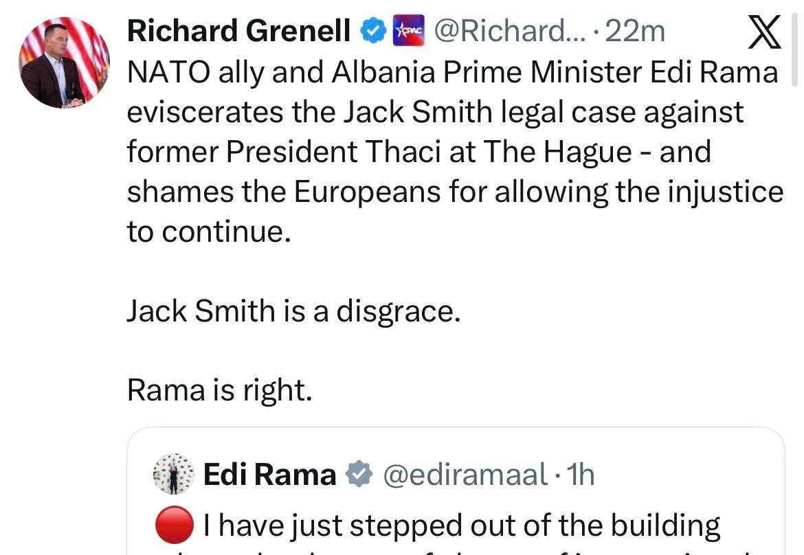“Aleati i NATO-s dhe kryeministri i Shqipërisë, Edi Rama, e hedh poshtë çështjen ligjore Jack Smith kundër ish-Presidentit Thaçi në Hagë – dhe i turpëron evropianët që lejojnë që padrejtësia të vazhdojë. Jack Smith është një turp. Rama ka të drejtë”, ka shkruar Grenell në llogarinë e tij në X.