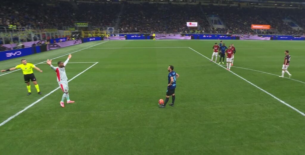 Në minutën e 59-të, Bastoni provojë të gjejë rrjetën, por goditja e tij përfundon mbi traversë. Në minutën e 70-të, ka një kontakt në zonë mes Pavlovic dhe Thuram,, më saktë pretendohet për një shkelje me takë dhe pas ndërhyrjes së VAR dhe rishikimit në ekran, arbitri drejton gishtin nga pika e bardhë e penalltisë. Godet i zakonshmi Calhanogolu, pret Mike Maignan.