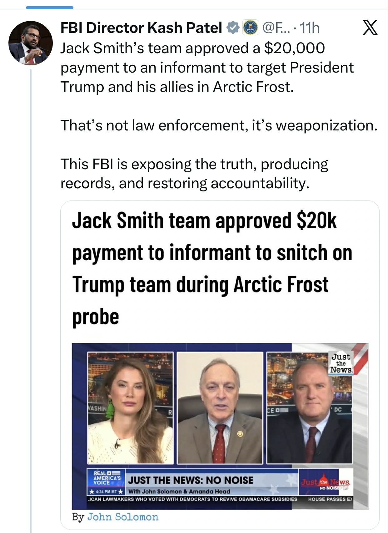 Kreu i FBI-së, Kash Patel, i tha Just the News se ky zbulim tronditës për pagesën e një spiuni ishte dëshmia më e fundit se hetimi “Arctic Frost” përbënte një “abuzim të rëndë me pushtetin dhe shkelje të ligjit”.