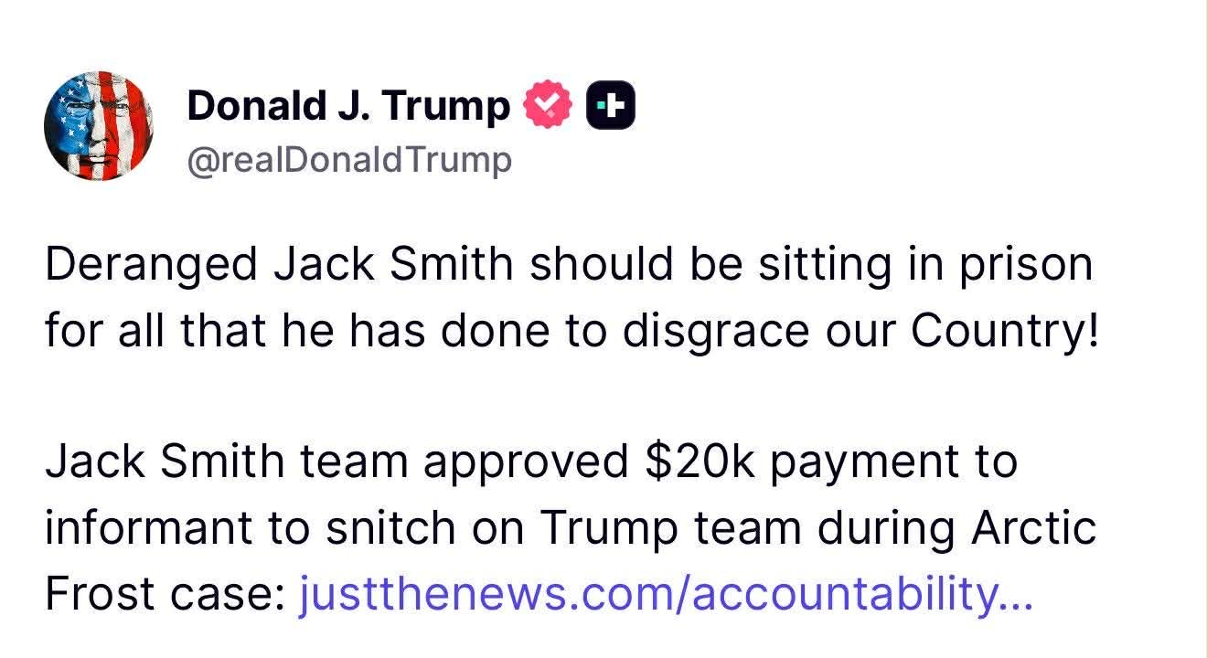 “Jack Smith i çmendur duhet të ishte në burg për gjithçka që ka bërë për ta turpëruar vendin tonë!”, ka shkruar ai.