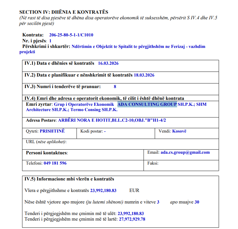 Tenderi për vazhdimin e punimeve në Spitalin e Ferizajt është fituar nga ky konsorcium: ADA CONSULTING GROUP SH.P.K.; SHM Architecture SH.P.K.; Termo Consing SH.P.K”.