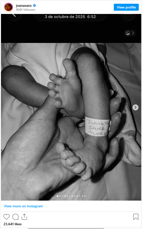 Pas një shtatzënie të mbajtur larg vëmendjes publike, në tetor Joana Sanz dhe Dani Alves njoftuan se ishin bërë prindër të vajzës së tyre të parë së bashku, e treta për ish-futbollistin brazilian, i cili ka edhe dy fëmijë nga martesa e mëparshme me Dinorah Santana.