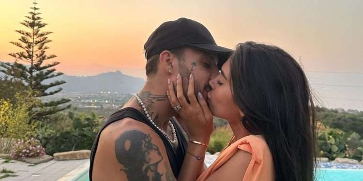 Aty ka pozuar me të dashurin I cili ka vendosur kokën tek ajo dhe njërën dorë nga mbrapa.