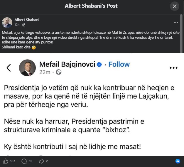 “Mefail, a ju ke tregu votuesve, si arrite me ndertu shtepi luksoze në Mal të Zi, apo, nësë do, unë shkoj një dite te shtepia jote atje, dhe e beje një video direkt nga shtepia! Ti e di mirë kush ti ka vendos dyert e dritaret, edhe une kam qenë aty puntor”, ka thënë Shabani.