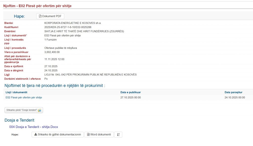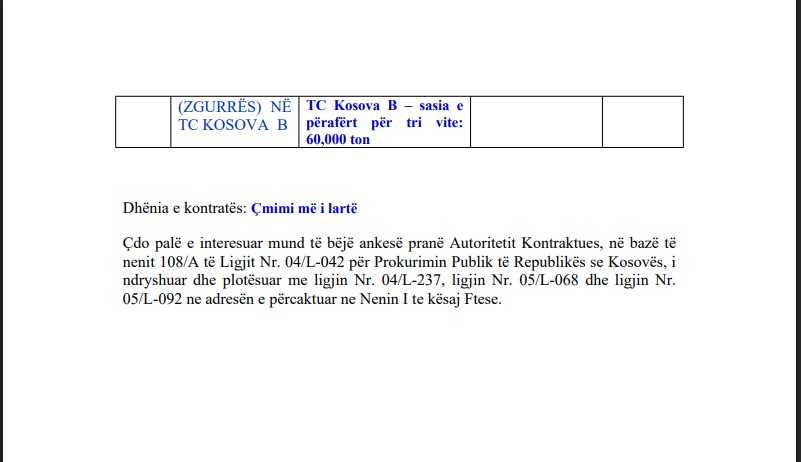 KEK ka bërë të qartë se nuk ka negociata dhe nuk ka kritere të tjera – kush ofron më shumë për ton, fiton. Vlera totale e parashikuar është 3,002,400 euro me TVSH.