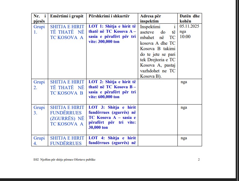 Afati për dorëzimin e ofertave është 11 nëntor 2025, ora 12:00, ndërsa KEK ka ftuar të gjithë të interesuarit që më 5 nëntor, në orën 10:00, të paraqiten për vizitë në terren, fillimisht në Kosova A, pastaj në Kosova B, për t’i parë nga afër lokacionet dhe kushtet teknike.