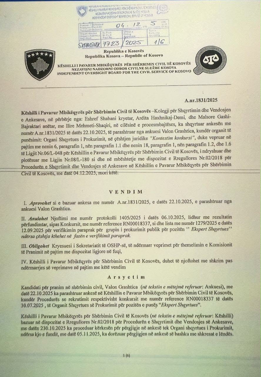 Këshilli konfirmon se njoftimi final i OSHP-së me protokoll 1405/2025, i shpallur më 06.10.2025, duhet të anulohet, ngase lista përfundimtare e kandidatëve të suksesshëm, në mesin e të cilëve ishin edhe asistentja ekzekutive e kryetarit të OSHP-së, Valbona Iballi, si dhe djali i një deputeti të Lëvizjes Vetëvendosje, Genc Dugolli është hartuar në kundërshtim me ligjin.