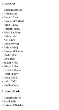 Autoritetet italiane kanë identifikuar të gjithë emrat e personave të arrestuar në këtë operacion të gjerë antidrogë. Ndërkohë, në Shqipëri, Asti Llupi, Erald Salla dhe Altin Shehaj janë vënë në pranga nga Policia e Shtetit, pas ekzekutimit të urdhrit të arrestit të lëshuar nga Gjykata e Breshias. (A2 Televizion)