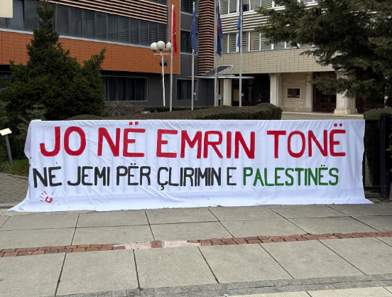 Organizata “Kolektivi për mendim dhe veprim feminist” kanë vendosur sot në hyrje të presidencës së Republikës së Kosovës një baner me mbishkrimin “Jo në emrin tonë, ne jemi për çlirimin e Palestinës”, duke kundërshtuar kështu vendimin e Kosovës për t’iu bashkuar Bordit të Paqes së themeluar nga SHBA-të.