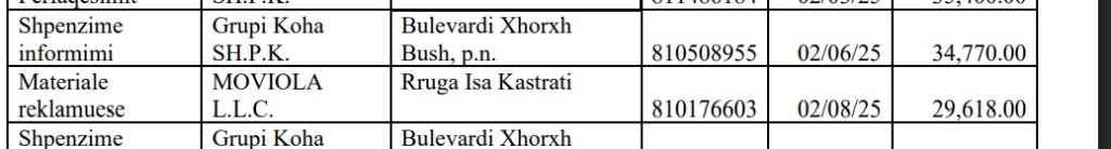 Në dokumentin e auditimit të fushatës, pagesa ndaj MOVIOLA është bërë më 8 shkurt 2025, vetëm një ditë para zgjedhjeve të parakohshme, në mesin e një liste të gjatë operatorësh ekonomikë që kanë ofruar shërbime mediale, grafike dhe reklamuese për Vetëvendosjen.