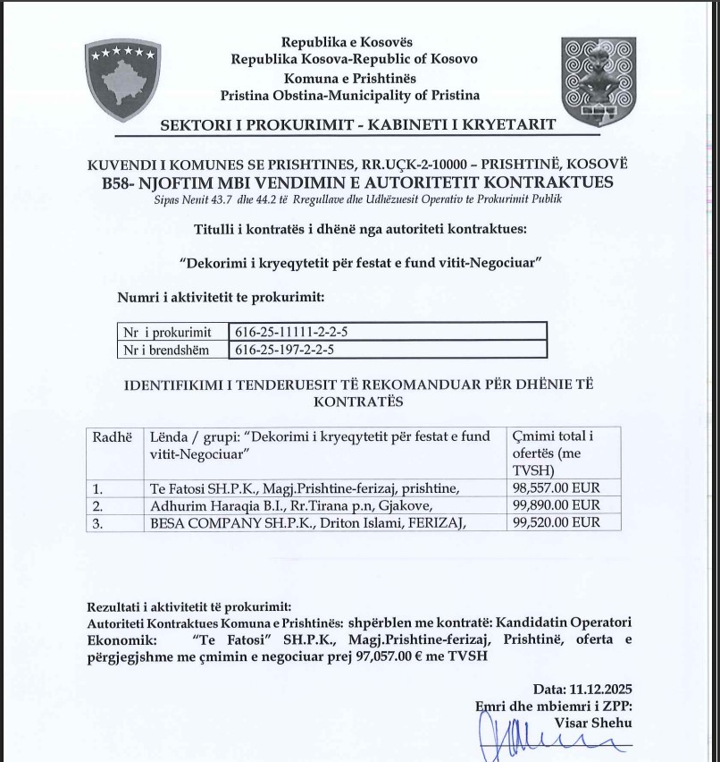 Vendimi për dhënien e kontratës është marrë më 11 dhjetor 2025, ndërsa njoftimi është nënshkruar nga zyrtari përgjegjës i prokurimit, Visar Shehu.