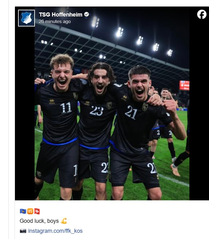 Pak para ndeshjes, Kosova ka marrë një urim të bukur nga klubi i Bundesligës, Hoffenheim, aty ku luajnë tre dardanë: Albian Hajdari, Leon Avdullahu dhe Fisnkik Asllani. Përmes një postimi në rrjetet sociale, Hoffenheim iu uron fat tre lojtarëve nga Kosova.