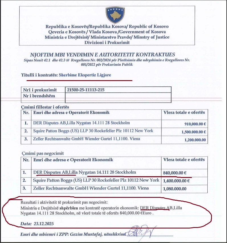 Kontrata, e cila pritet të nënshkruhet sot, ka vlerë 840 mijë euro, ndërsa afati i saj është 36 muaj. Kjo shumë mbulon shërbimet e përfaqësimit të Kosovës në një procedurë arbitrazhi që pritet të jetë e ndërlikuar dhe me rrezik potencial financiar për buxhetin e shtetit.