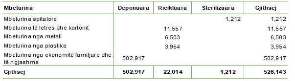 • 502 mijë e 917 ton, ose 95,6%, janë mbeturina të deponuara, që kryesisht vijnë nga ekonomitë familjare dhe aktivitetet e ngjashme;