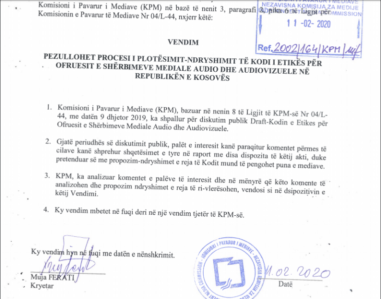 KPM-ja ka marrë vendim që të pezullojë procesin e plotësim-ndryshimit të Kodit të Etikës për ofruesit e shërbimeve mediale audio dhe audiovizuele në Republikën e Kosovës.