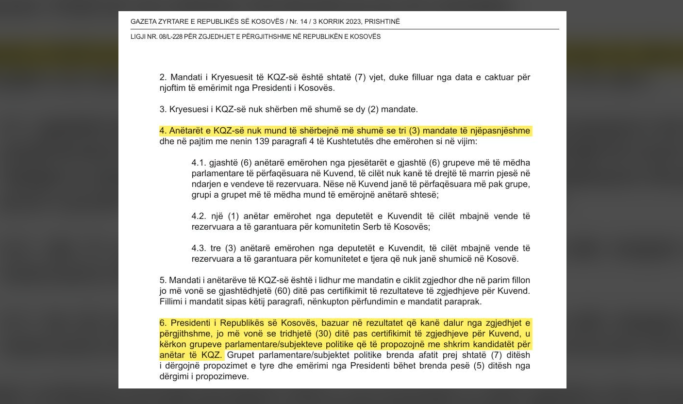 Sipas nenit 4 të këtij ligji, “Anëtarët e KQZ-së nuk mund të shërbejnë më shumë se tri (3) mandate të njëpasnjëshme”.