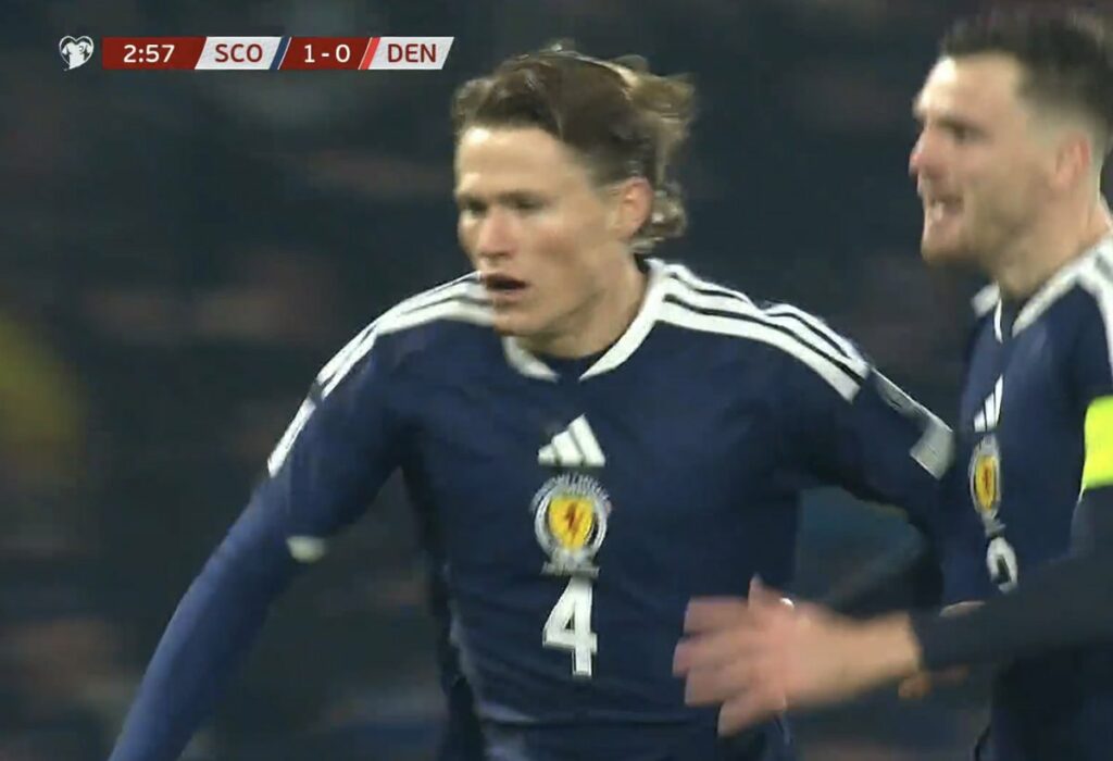 Në “Hampden Park” në Glasgow, Skocia po udhëheq 1-0 ndaj Danimarkës. Për vendasit shënoi Scot McTominay në minutën e tretë, një gol spektakolar me rroveshatë. Me këtë rezultat, Skocia mban vendin e parë, Danimarka të dytin.