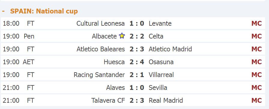 Cultural Leonesa sakaq ka dërguar në shtëpi ekipin e Levantes me një fitore minimale 1-0 dhe Deportivo Alaves ka bërë të njëjtën gjë me Sevilla-n. Osassuna sakaq fitoi me poker në fushën e Huescas (2-4).