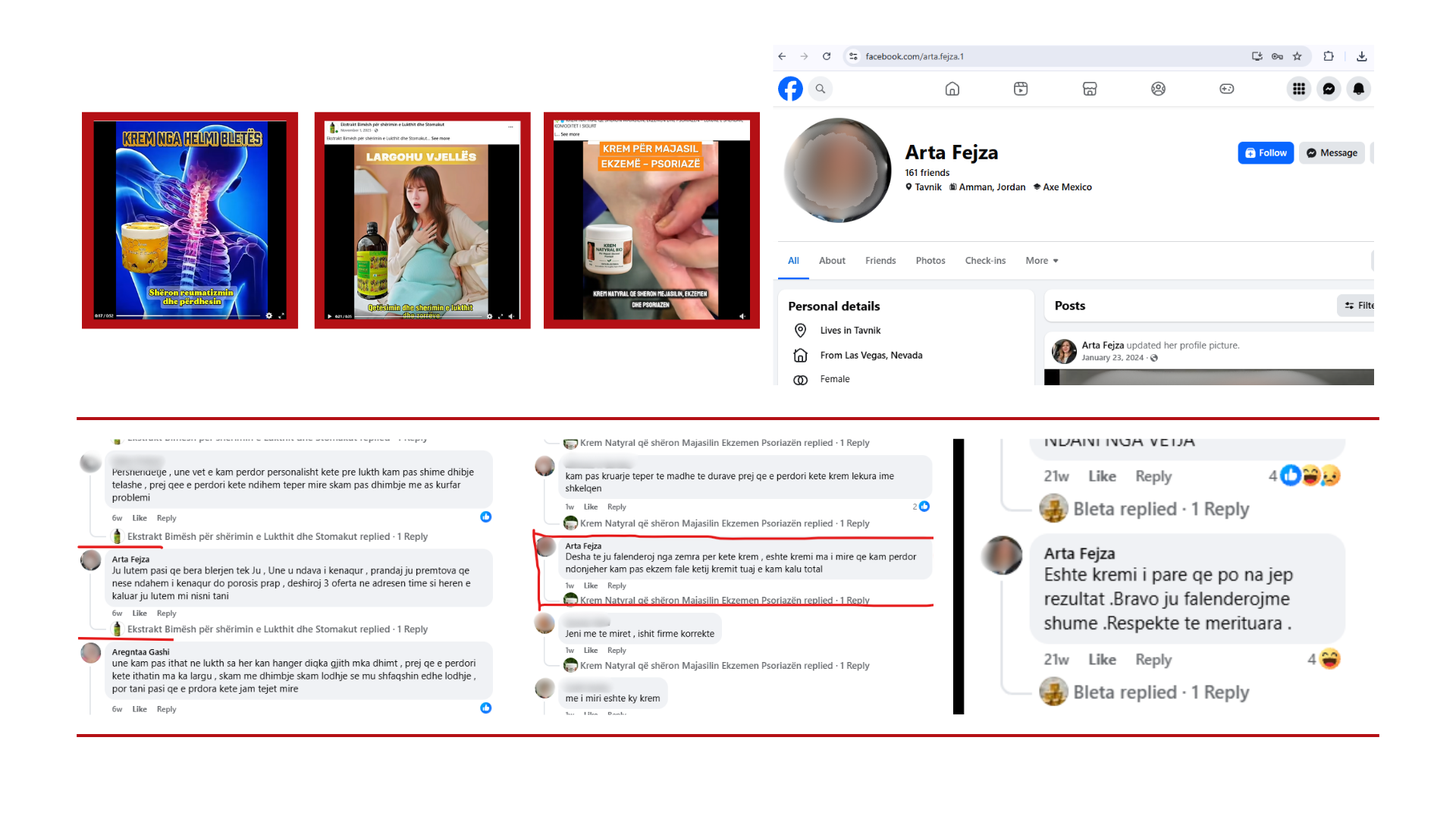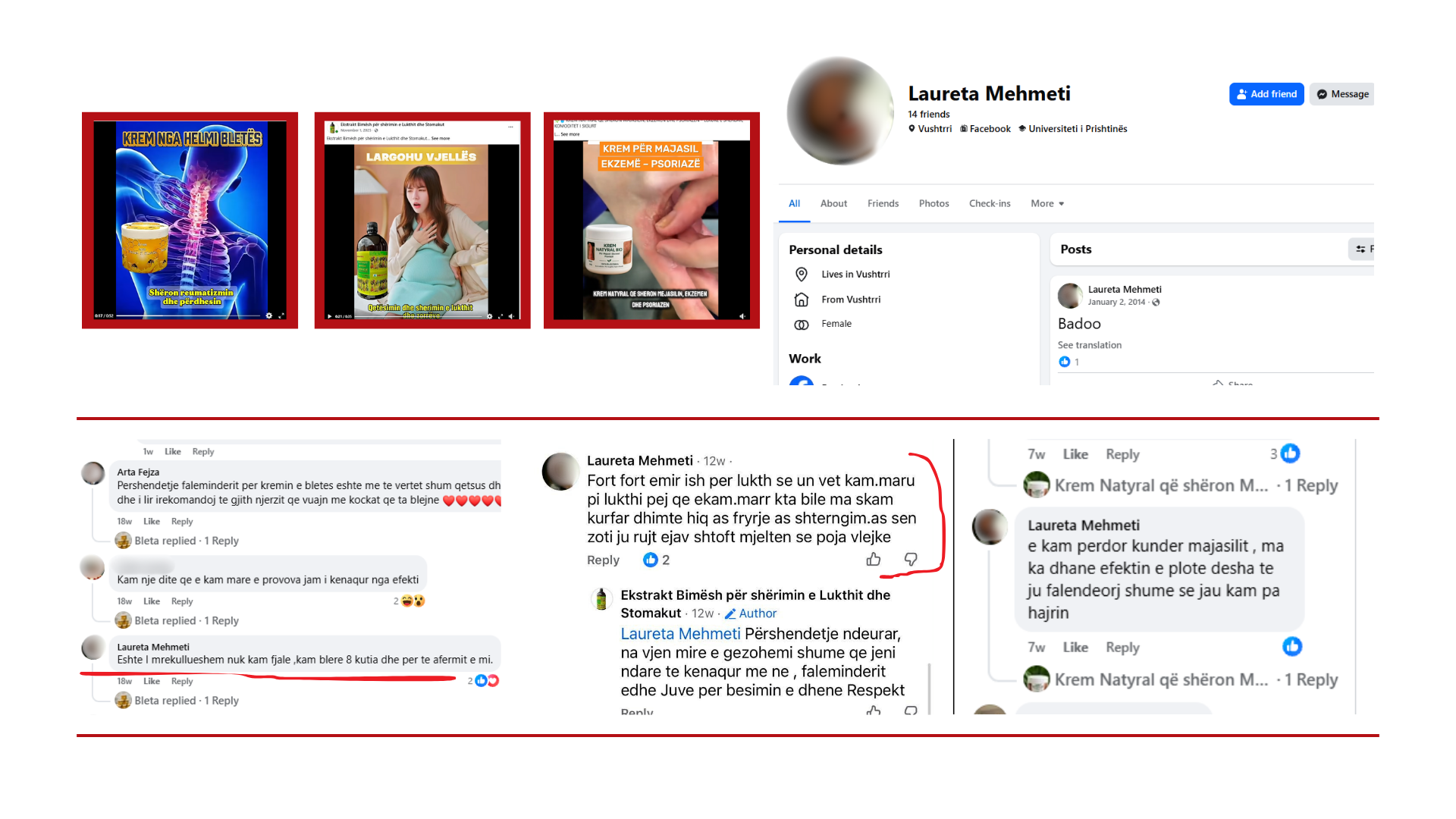 Arta Fejza, Laureta Mehmeti, Aregntaa Gashi dhe profile të tjera të rreme me karakteristika të njejta si këto më lartë, si Egzona Saraqi, Valon Prekzai, Erblin Hoxha, Marigona Berisha e disa të tjerë, komentojnë thuajse në të gjitha produktet që kemi identifikuar ne. Kjo praktikë bëhet me qëllim të bindjes së qytetarëve se produkti po blihet dhe ka efekt, duke përcjellë një mesazh të rremë dhe duke krijuar perceptimin e sigurisë dhe efikasitetit tek përdoruesit e tjerë.