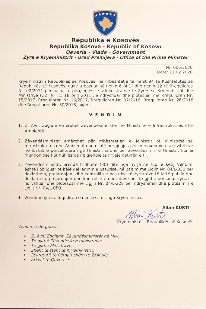 Kryeministri i ri i vendit, Albin Kurti, e ka emëruar sot Avni Zogianin zëvendësministër të Infrastrukturës dhe Ambientit.