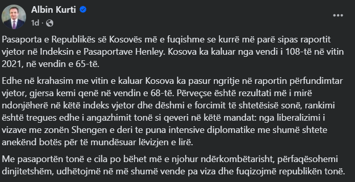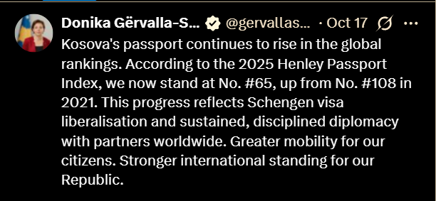 Në një valë autopromovimi, deputetët Albin Kurti dhe Donika Gërvalla publikuan posterë shumëngjyrësh për “suksesin historik” të pasaportës së Kosovës në Henley Passport Index 2025. Sipas tyre, ngritja nga vendi i 108-të në të 65-in është dëshmi e “punës intensive diplomatike me shumë shtete anekënd botës për të mundësuar lëvizjen e lirë.”