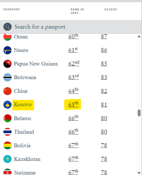 Sipas Henley Passport Index 2025, pasaporta e Kosovës renditet në vendin e 65-të, me 81 destinacione pa vizë paraprake. Në vitin 2021, ajo ishte në vendin e 108-të. Një rritje numerike, po, por e shkaktuar nga një faktor kryesor: liberalizimi i vizave nga BE-ja.