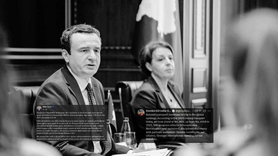 Në një valë autopromovimi, deputetët Albin Kurti dhe Donika Gërvalla publikuan posterë shumëngjyrësh për “suksesin historik” të pasaportës së Kosovës në Henley Passport Index 2025. Sipas tyre, ngritja nga vendi i 108-të në të 65-in është dëshmi e “punës intensive diplomatike me shumë shtete anekënd botës për të mundësuar lëvizjen e lirë.”