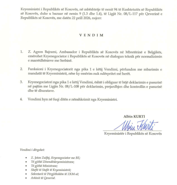 “Kryeministri i Republikës së Kosovës, Albin Kurti, ka emëruar z. Agron Bajrami në pozitën: Kryenegociator i Republikës së Kosovës në dialogun teknik për normalizimin e marrëdhënieve me Serbinë.”, thuhet në njoftim.