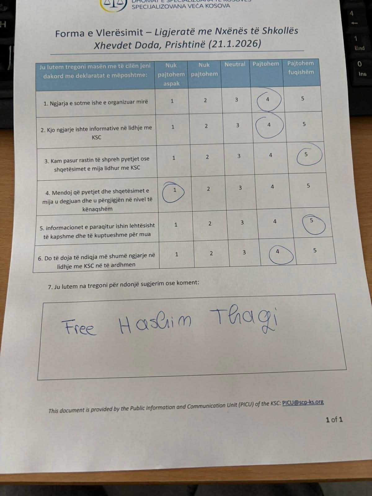 Një fotografi e publikuar në rrjetet sociale tregon një dokument që përmban logon dhe të dhënat e Gjykatës Speciale e cila u është shpërndarë nxënësve të gjimnazit në ligjërimin e së enjtes.